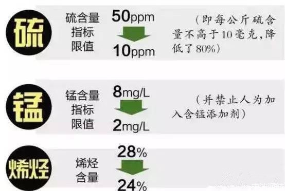 这一次的汽、柴油由国四标准调整为国五标准,将更加环保。这次国五标准的实施,最主要的就是带来油品一系列指标的降低:国五标准的汽油硫含量指标限值由每千克50毫克降低为每千克10毫克,锰含量指标限值由每升0.008克降低为每升0.002克。烯烃含量从28%降低到了24%。同时汽油辛烷值与抗爆性降低了,89,92,95号其抗爆指数已修改为“不小于84、87、90”。